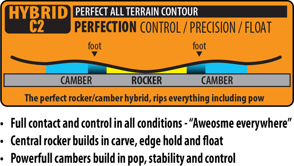 C2 to hybrydowa technologia wymyślona przez Travisa Rice’a. Rocker pomiędzy wiązaniami a poza nimi promieniowy camber. Deska bardzo dobrze trzyma krawędź szczególnie przy szybkiej jeździe, bardzo dobrze zachowuje się na lądowaniach i w puchu. A przy tym nie przeszkadza przy małej prędkości i trikach na stoku. Patent Mervin Mfg.